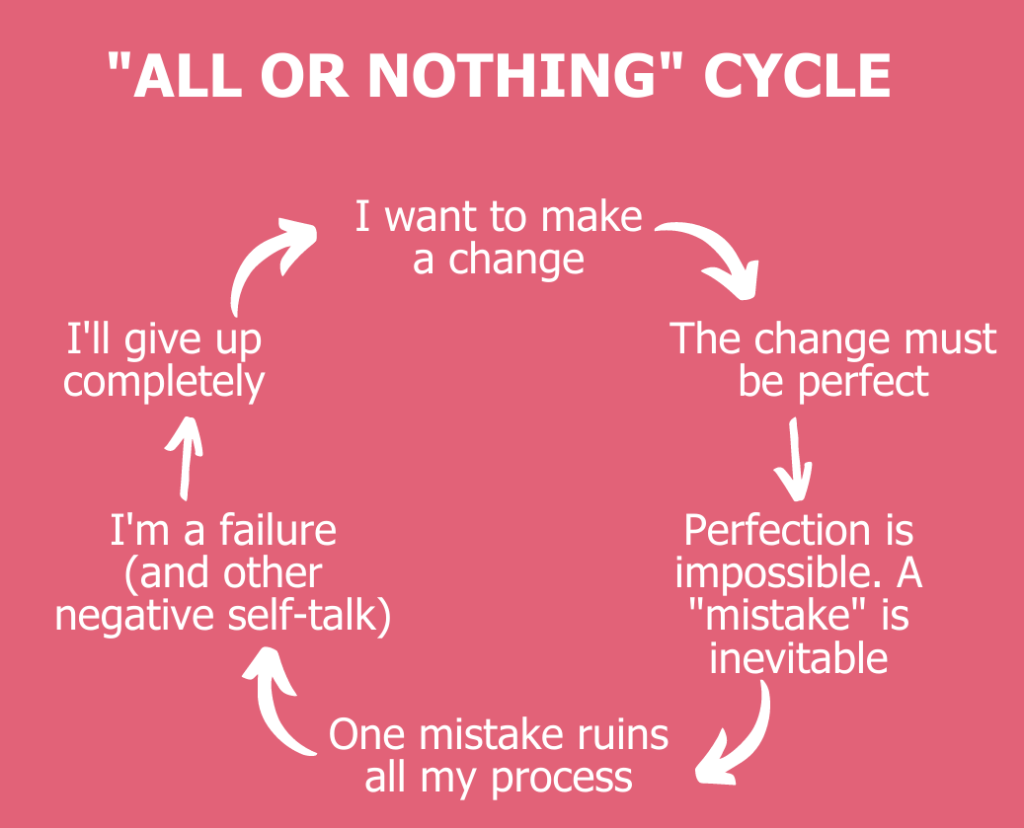 The mentality is very common among people, who set goals that are too drastic, such as cutting out carbs or fats completely. Such extreme measures are often unsustainable and can lead to nutrient deficiencies.