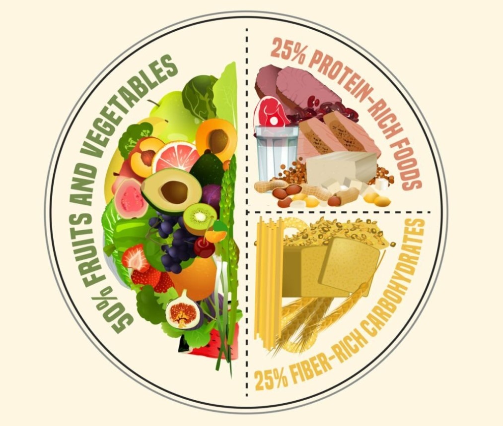 Adhere to the 50-25-25 rule: 50% vegetables, 25% protein (such as dal, paneer, tofu, chicken), and 25% whole grains (brown rice, quinoa, millets).